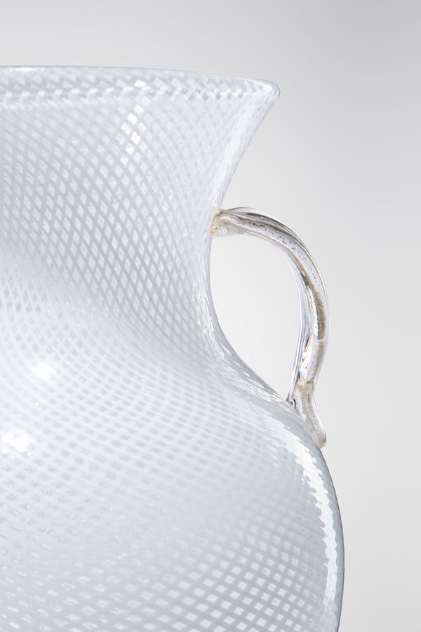 Vetro soffiato decorato a reticello lattimo, due anse e base in vetro cristallo con inclusione di foglia d’oro.