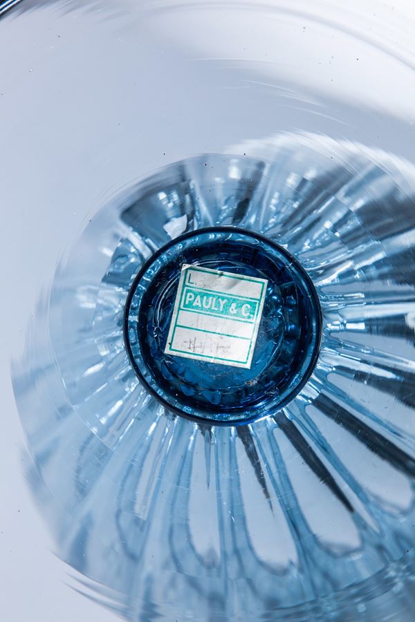 Vetro soffiato bluino, corpo costolato, piede a disco applicato a caldo e collo svasato.
