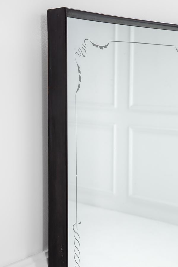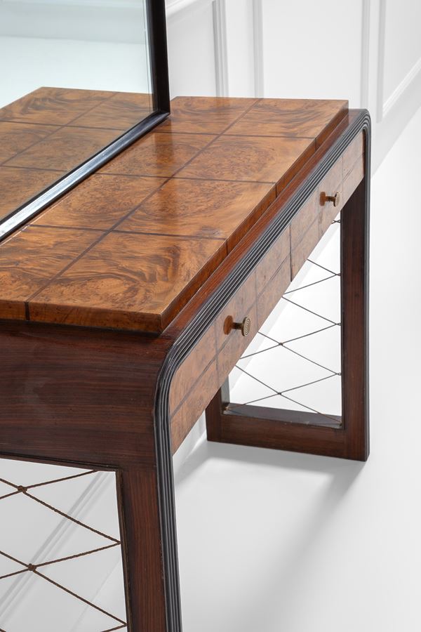 Legno impiallacciato, radica, legno ebanizzato, corda, vetro specchiato con decori a fogliame.