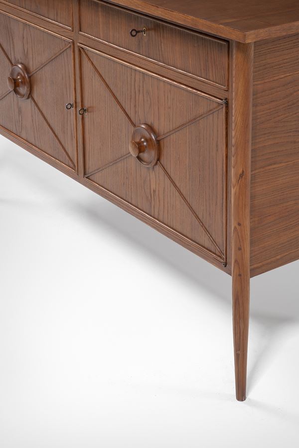Legno massello, legno impiallacciato, decori in legno a rilievo.