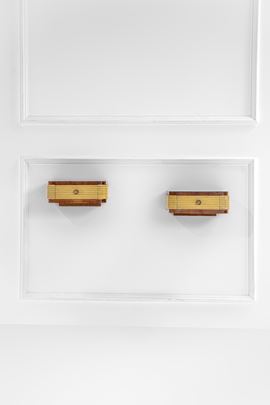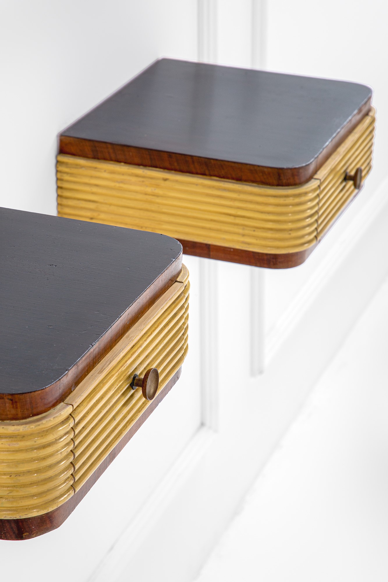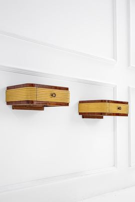 Legno impiallacciato, legno grissinato laccato, ottone.