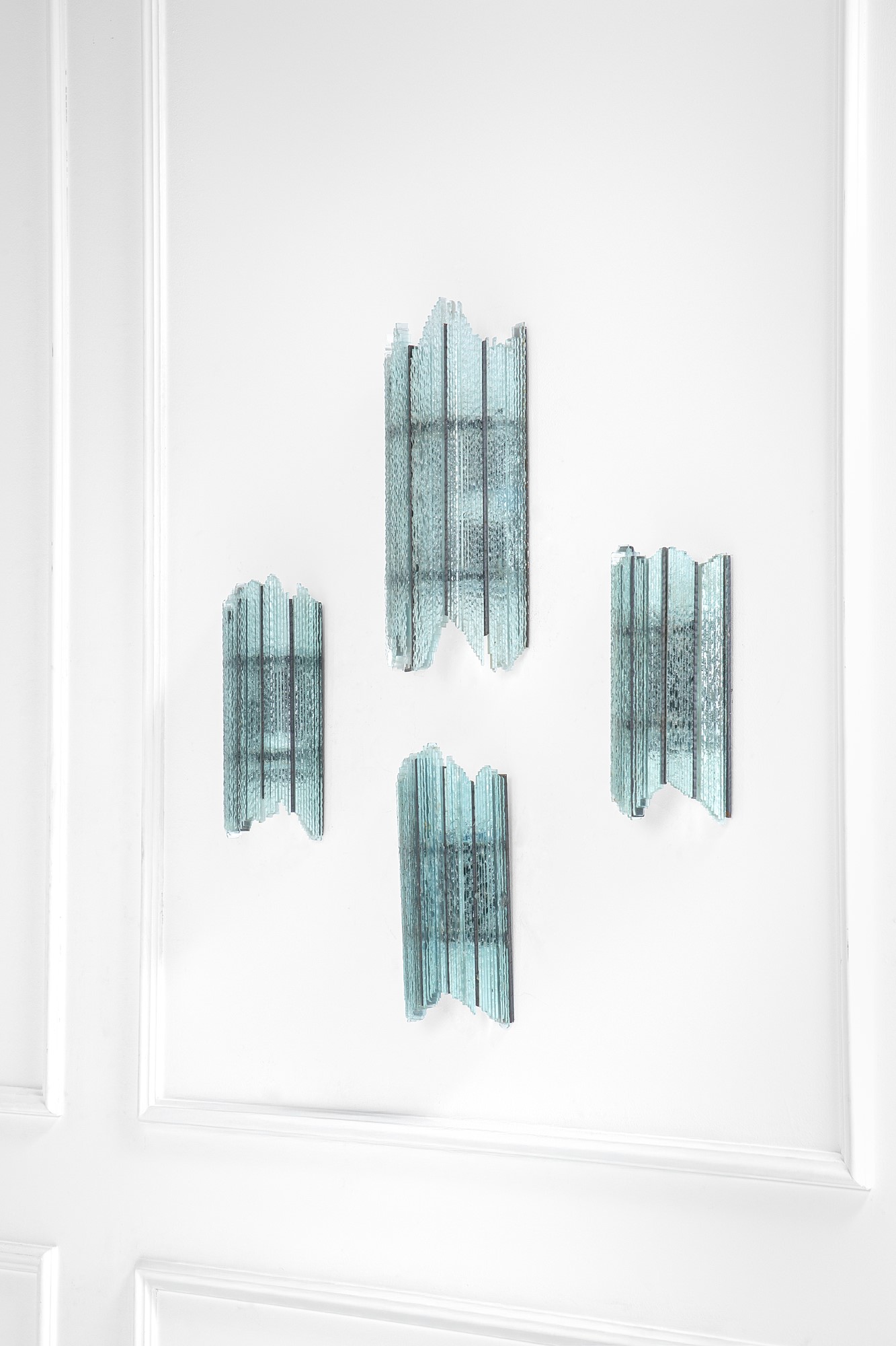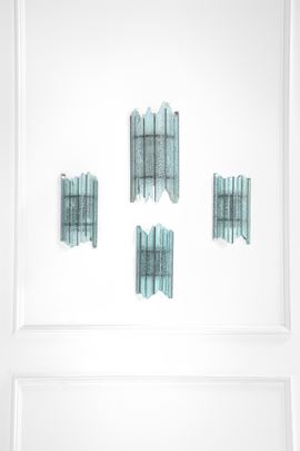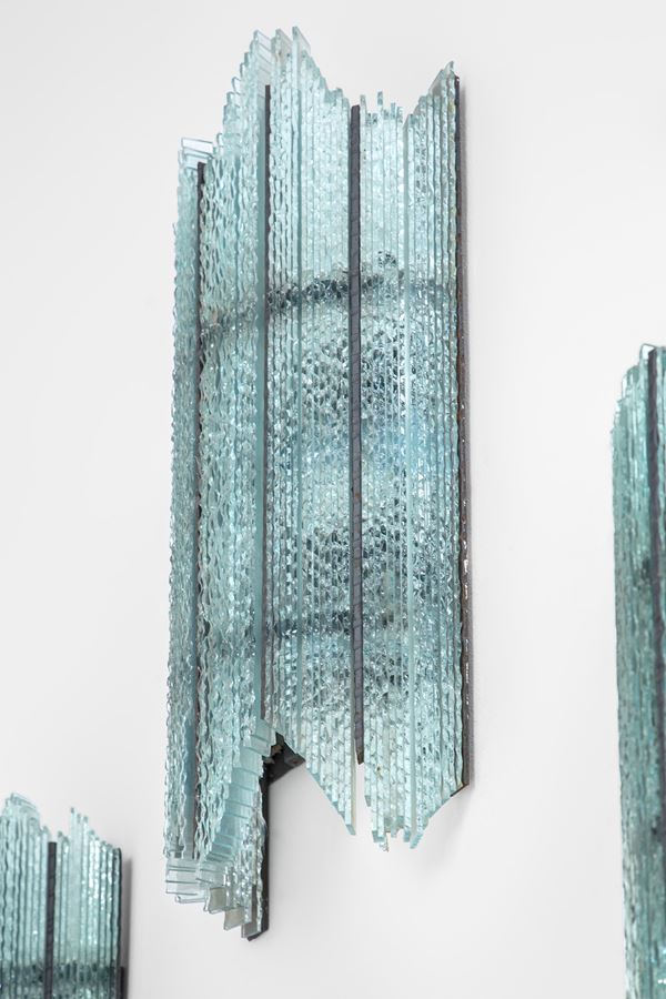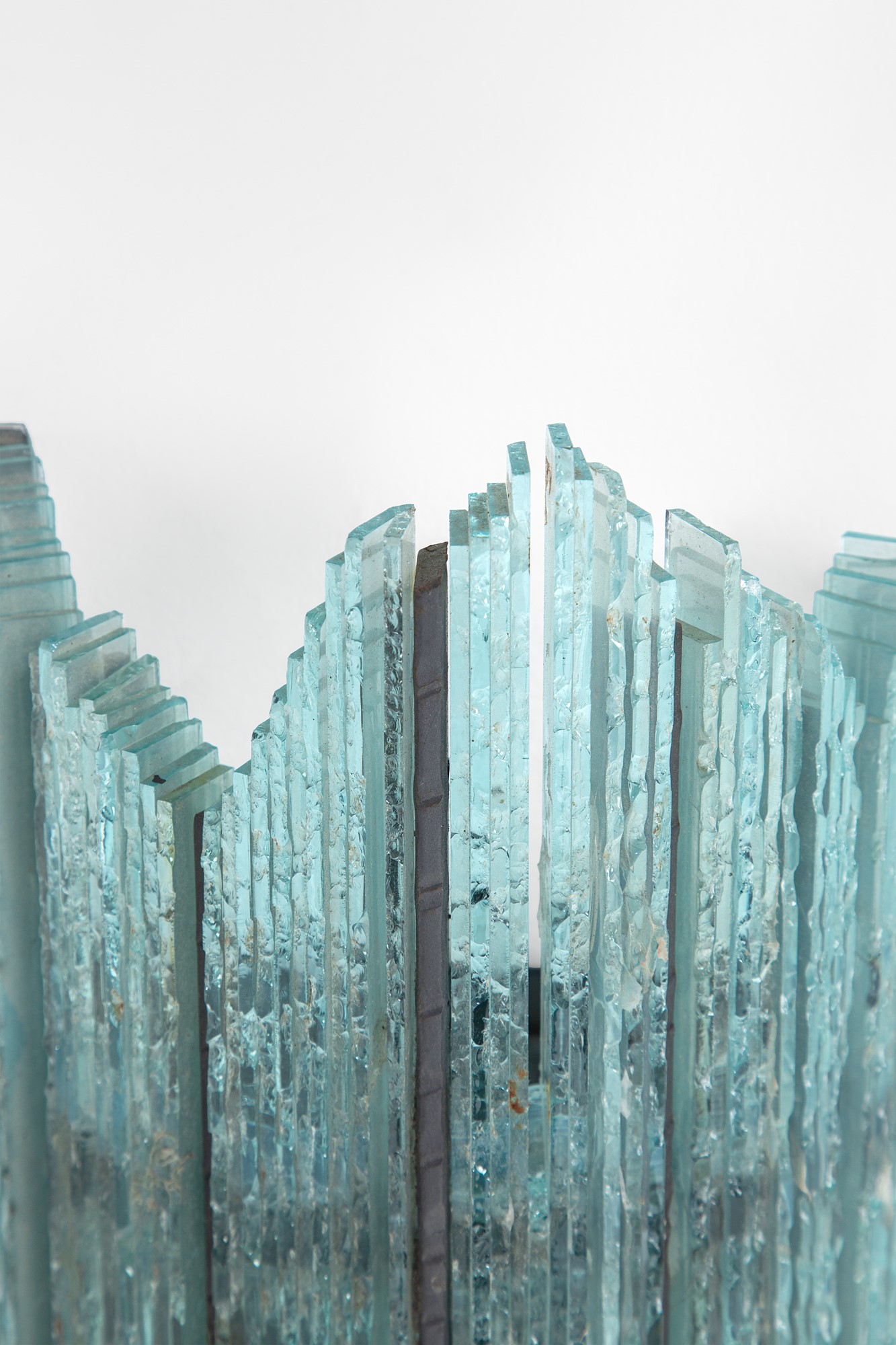 Elementi in vetro di forte spessore lavorati a spacco, metallo verniciato.