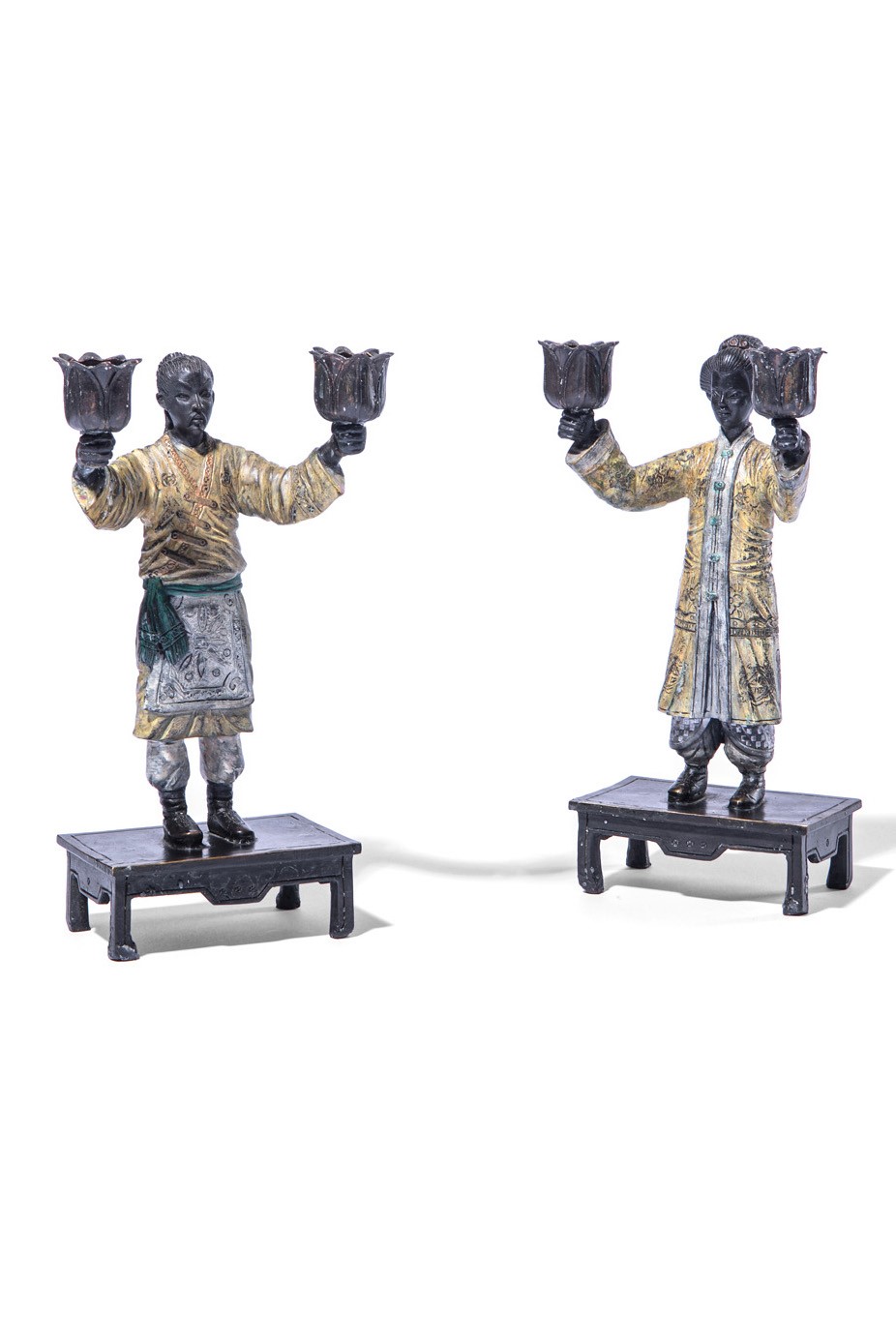 Coppia di candelieri a due luci sorrette da personaggi orientali.
