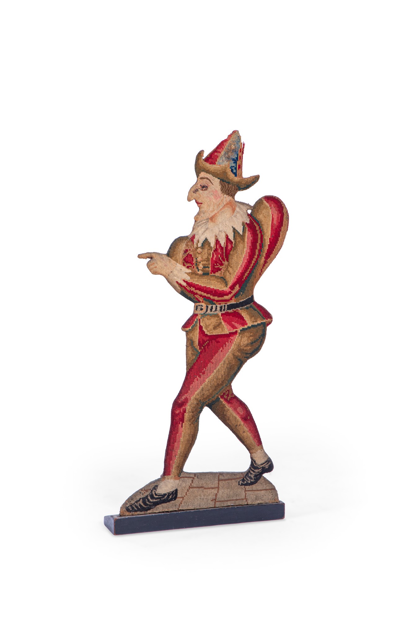 Fermaporta in legno intagliato a raffigurare paggetto ricoperto in piccolo punto.