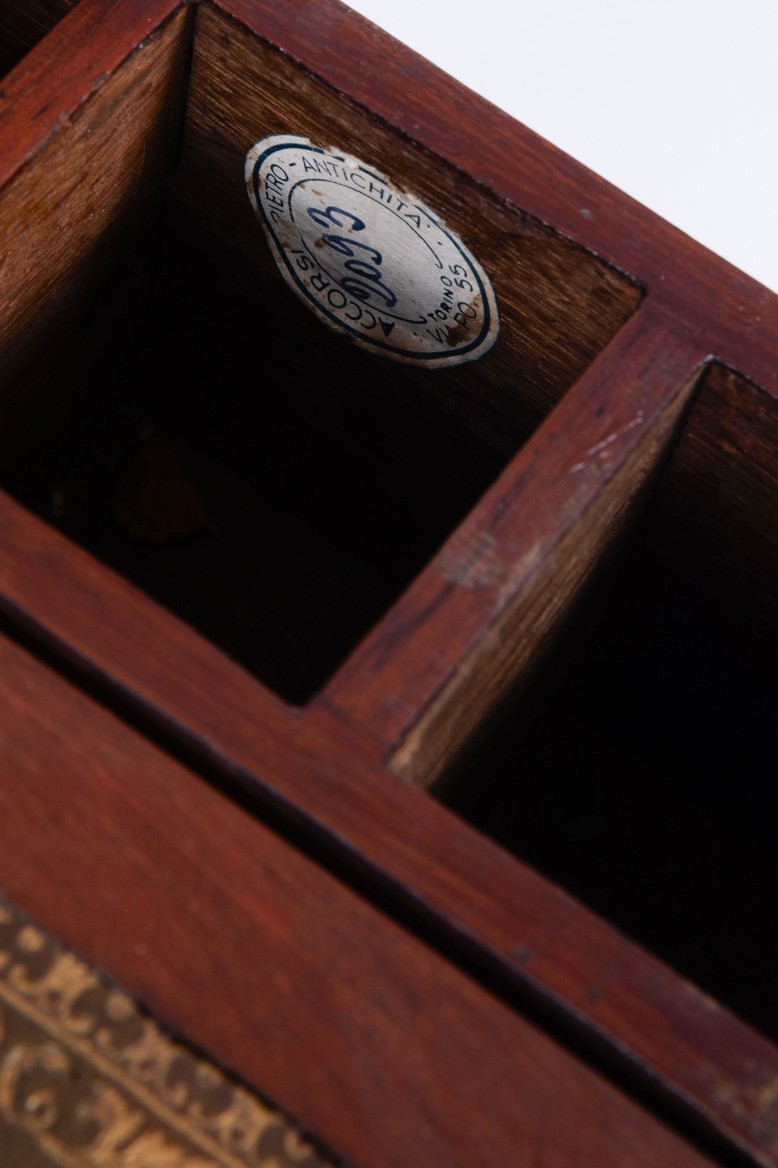 Mobiletto a tre cassetti frontali in legno impiallacciato. Primo cassetto celante un pianetto scrittoio ribaltabile.