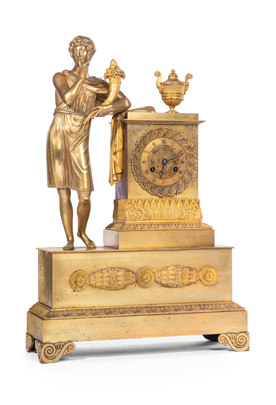 Orologio in bronzo dorato affiancato da figura classicheggiante con cornucopia e urna a raffigurare l'allegoria della prudenza.