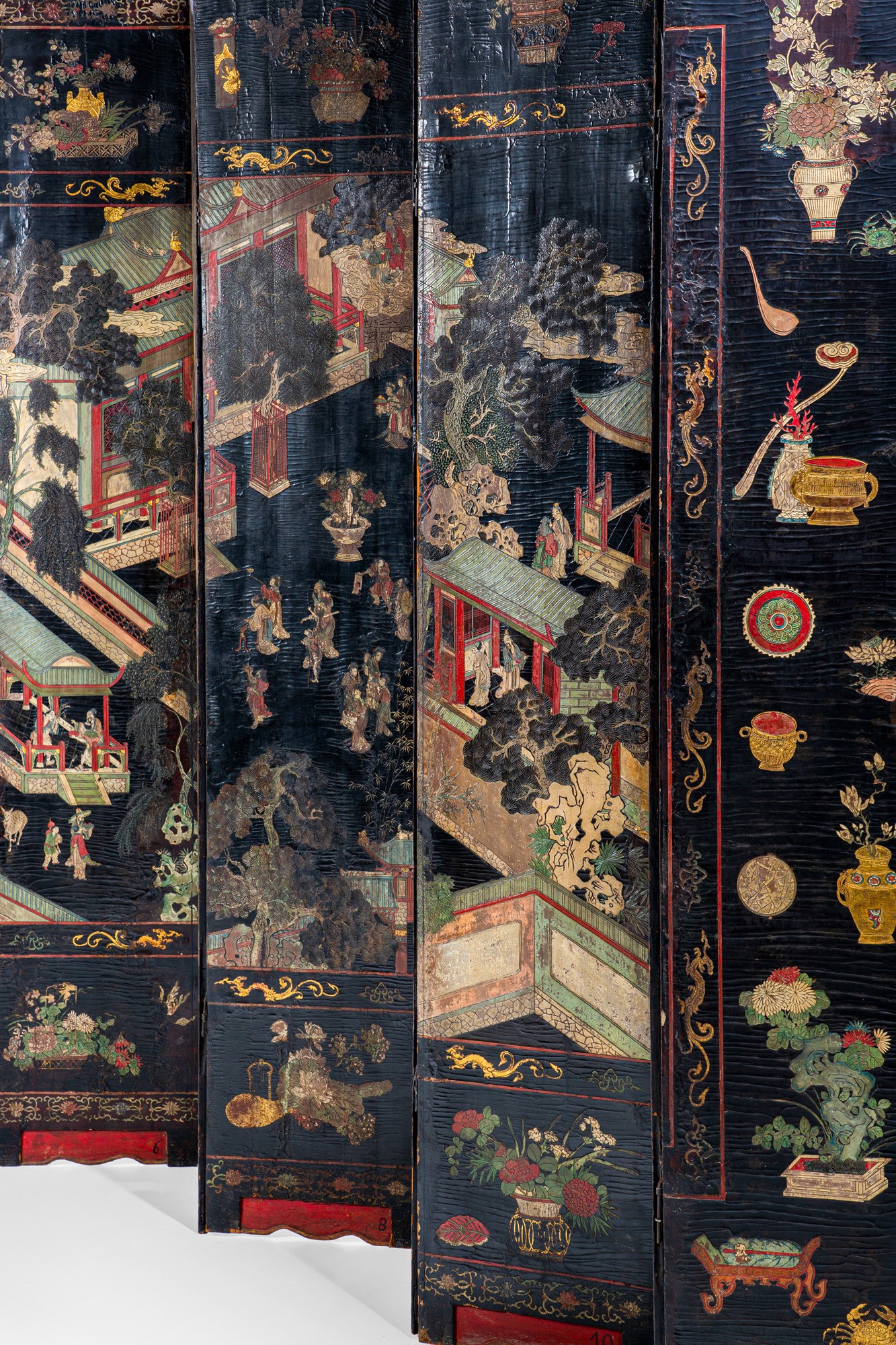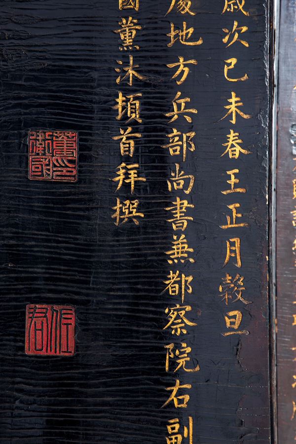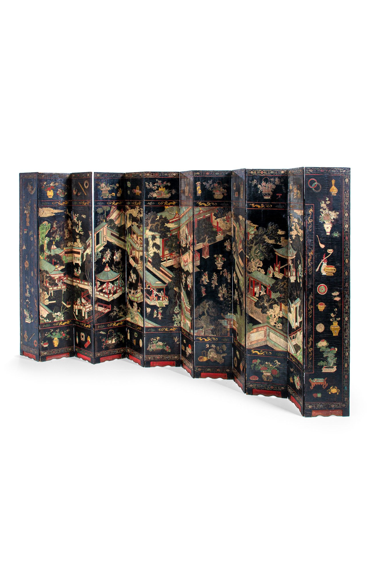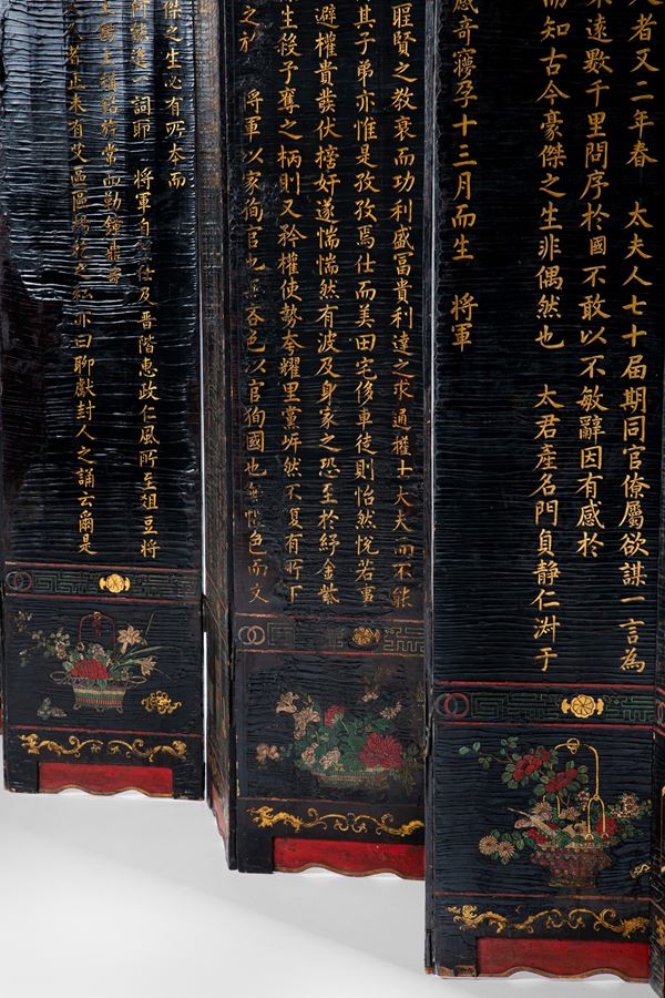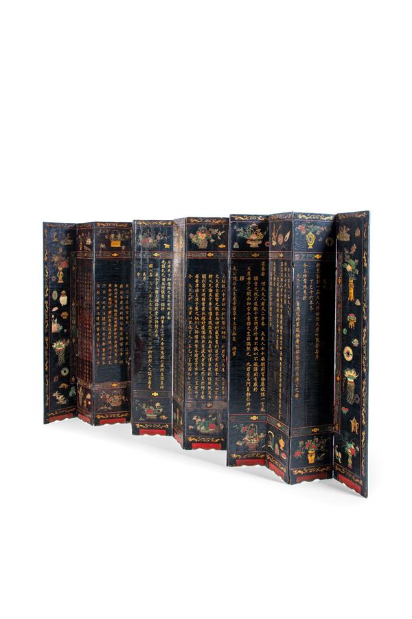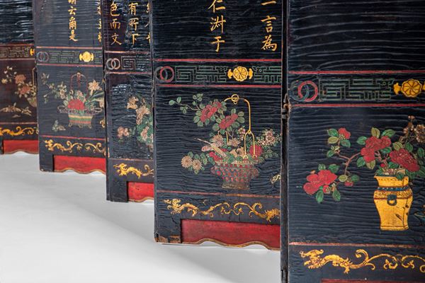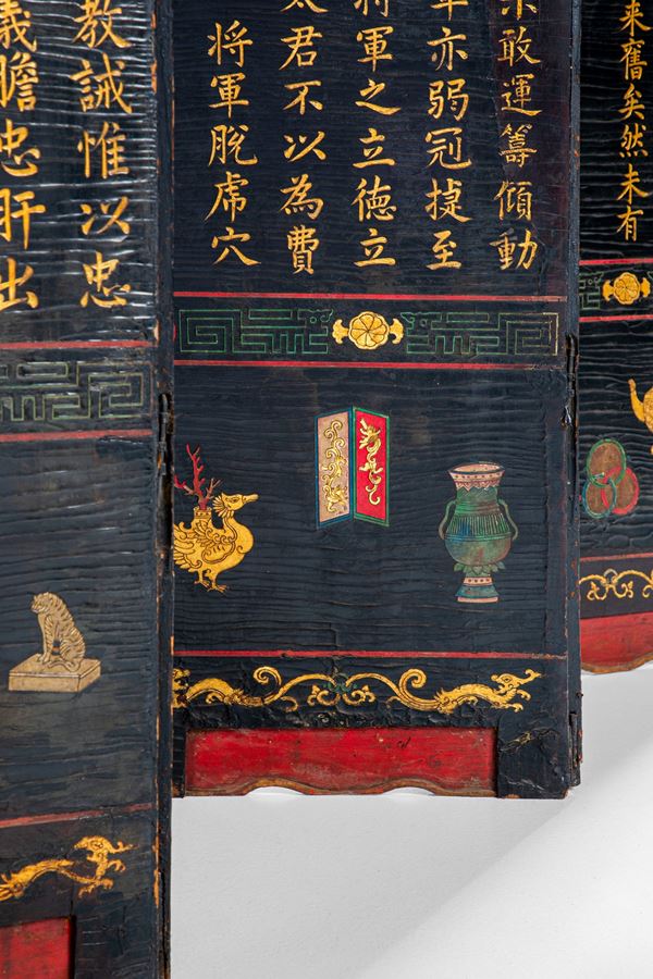Legno laccato in policromia su fondo nero e in parte dorato.