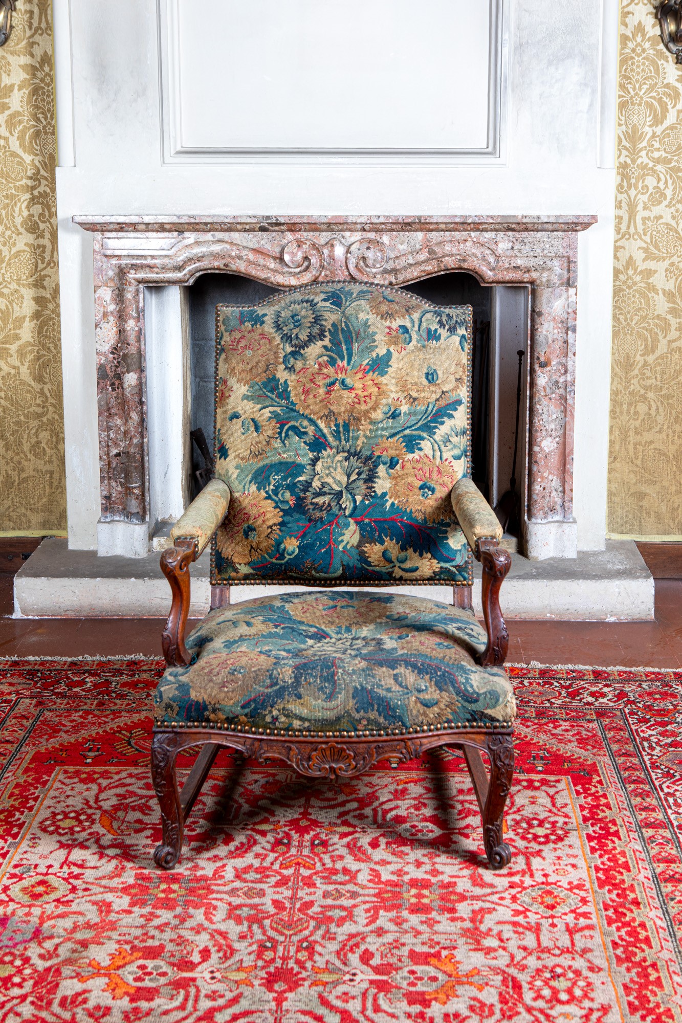 Legno di noce, rivestimento in tessuto a piccolo e grande punto.