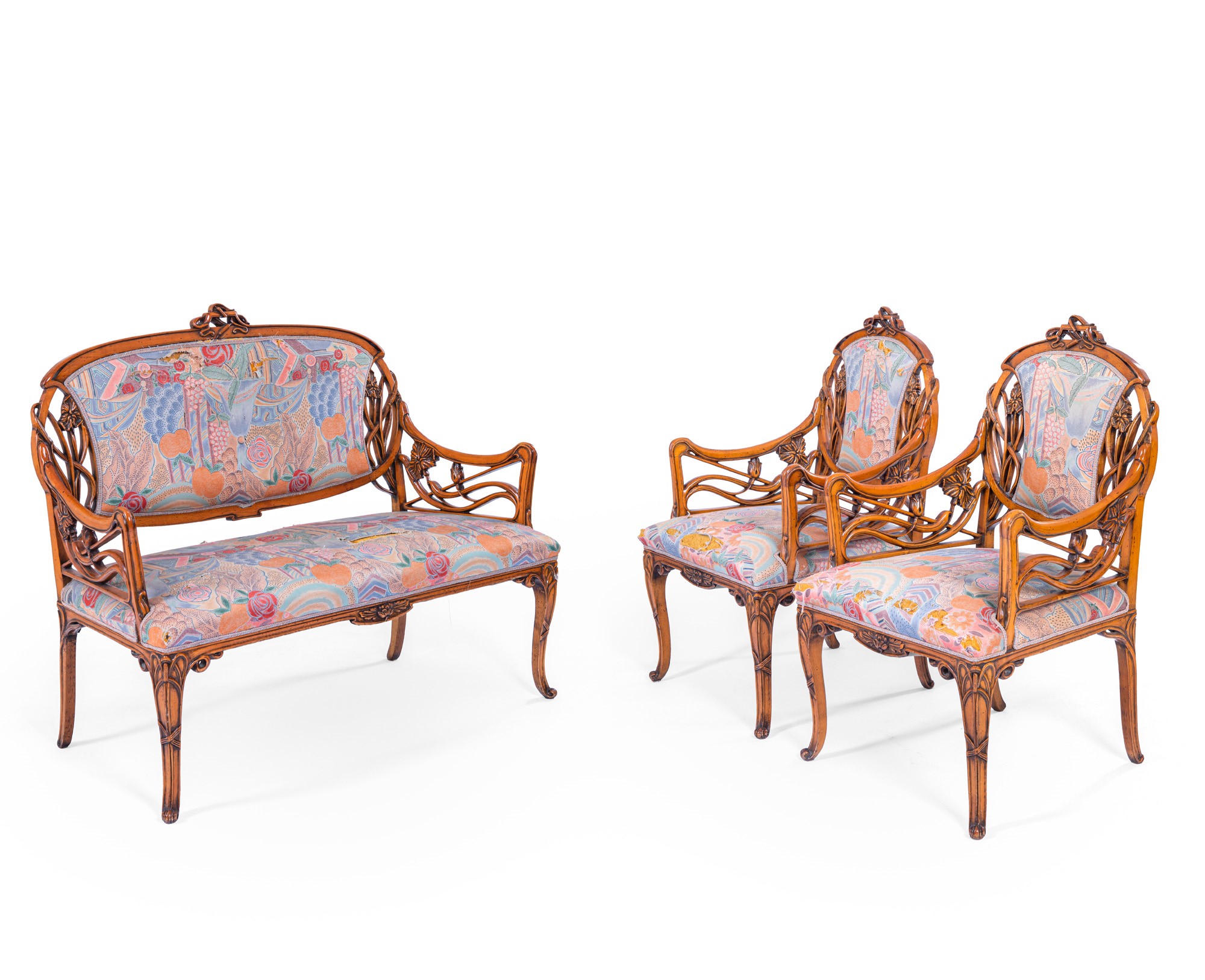 Salottino composto da un divano e due poltroncine nello stile liberty.