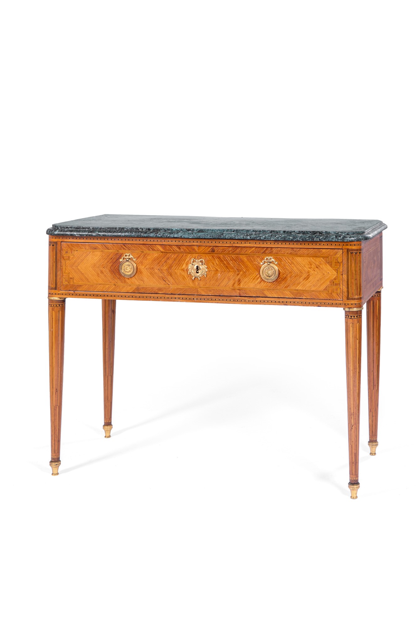 Tavolo da muro ad un cassetto in legno impiallacciato e intarsiato.
