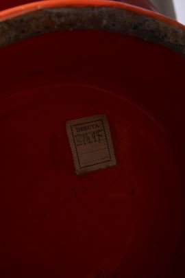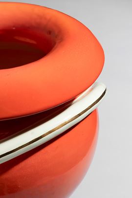 Ceramica invetriata arancio decorato da una fascia bianca in rilievo applicata in diagonale.