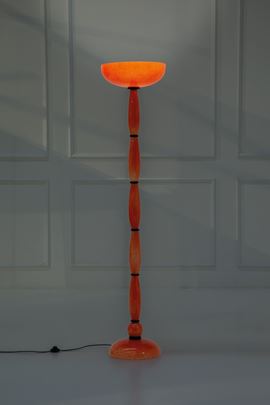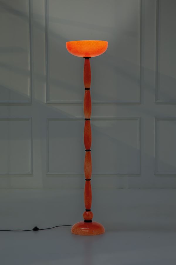 Metallo verniciato, vetro di Murano incamiciato bianco lattimo/arancione, vetro nero.