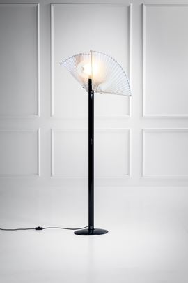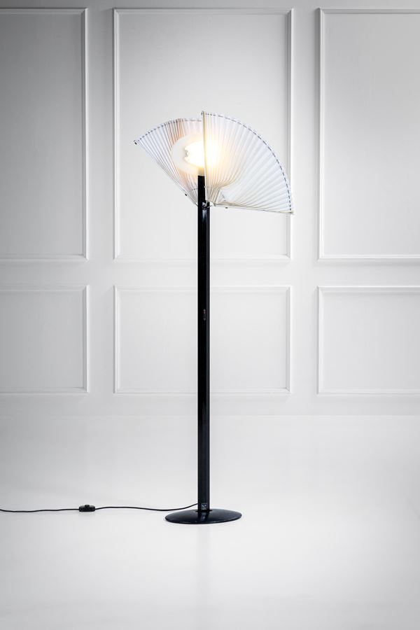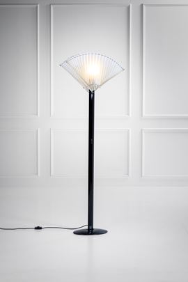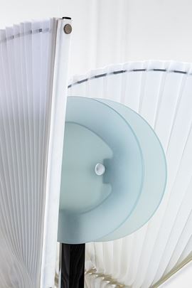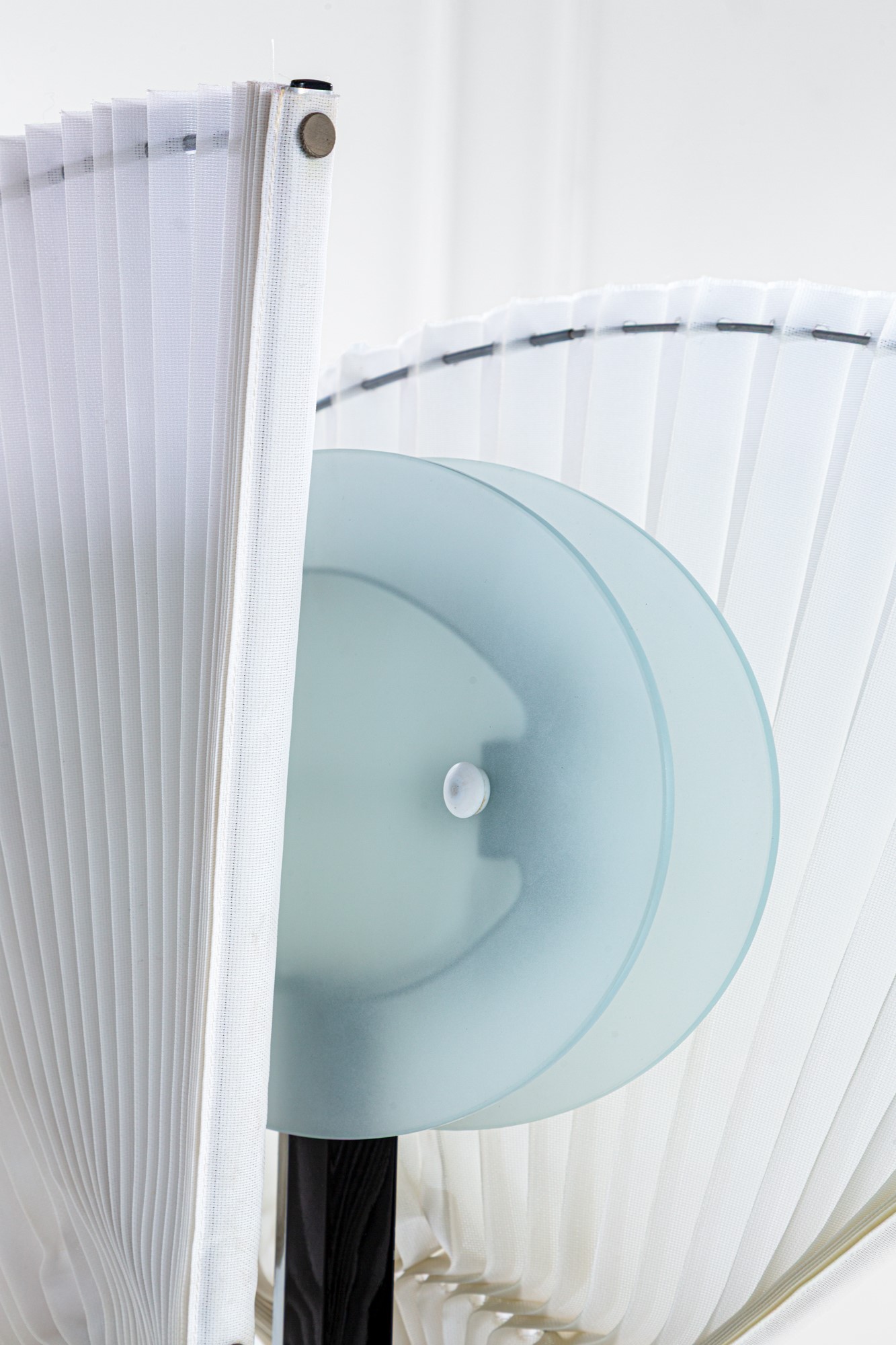Metallo verniciato, vetro satinato, tessuto ignifugo plissettato. Intensità luminosa variabile.