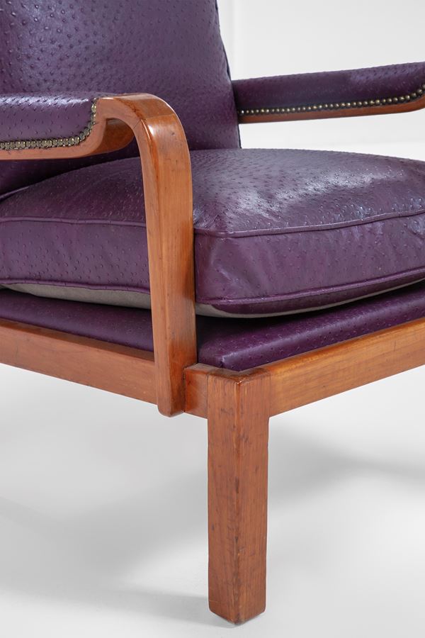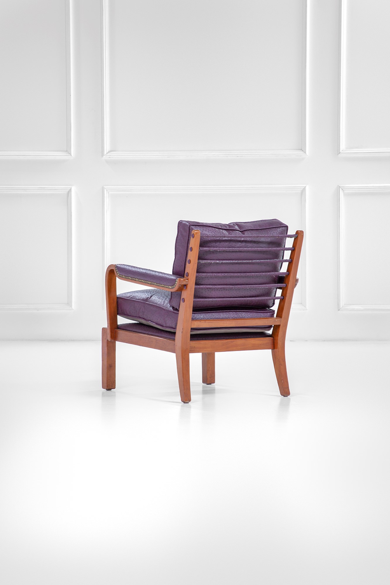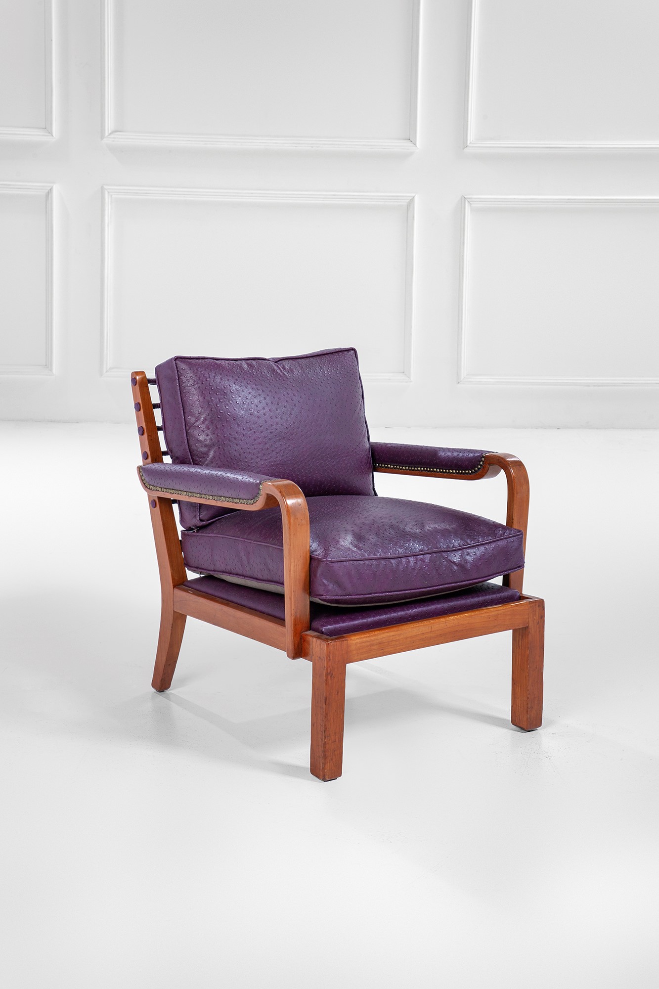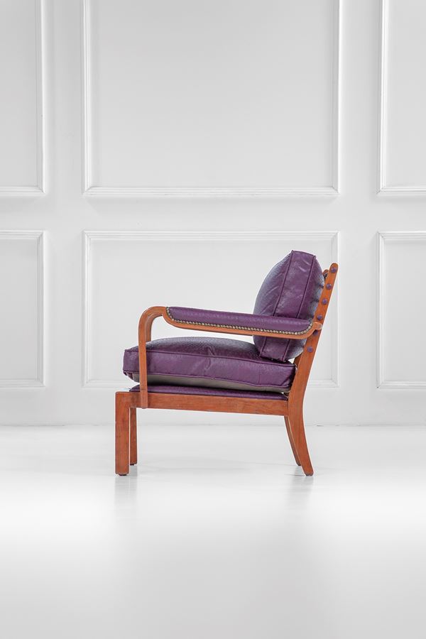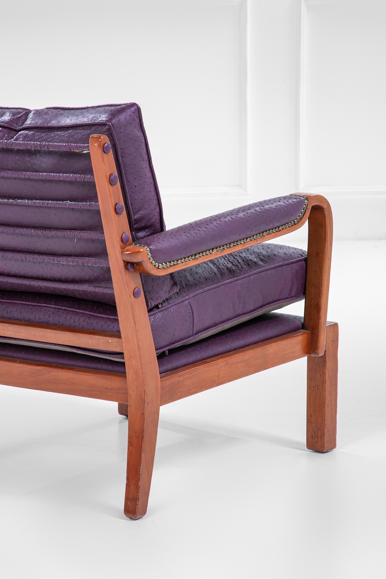 Legno massello sagomato, pelle, molle metalliche rivestite in pelle.
